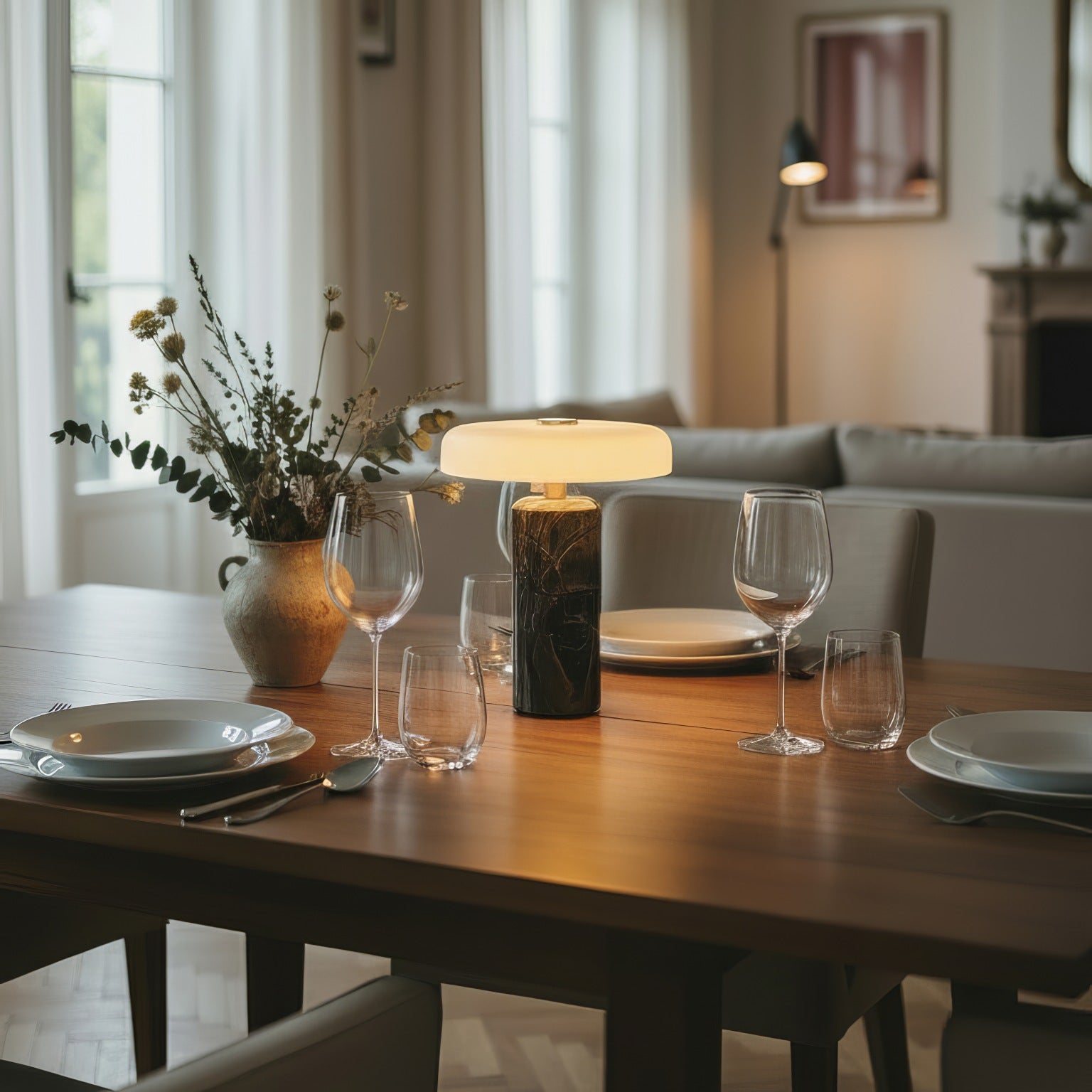 Crafted from natural stone and glass, each lamp is one of a kind.